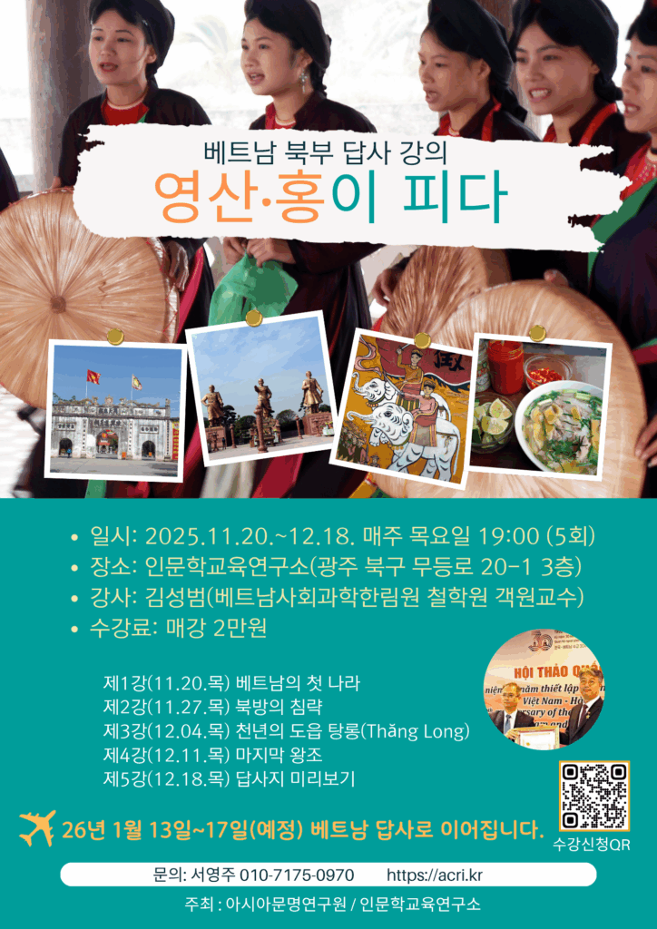 아시아문명연구원의 첫번째 아시아 문명 답사에서 영산강 문명과 홍강 문명의 만남을 직접 경험합니다. 하구둑이 없는 홍강에는 여전히 배가 물길을 따라 드나듭니다. 홍강은 남도의 영산강이 그러하듯 삶의 터전이자, 국제적 문명교류의 물길이며, 외침의 길목이고, 세계로 나아가는 관문입니다. 이제 그 홍강과 주변 마을들을 찾아 나서는 인문기행이 시작됩니다.