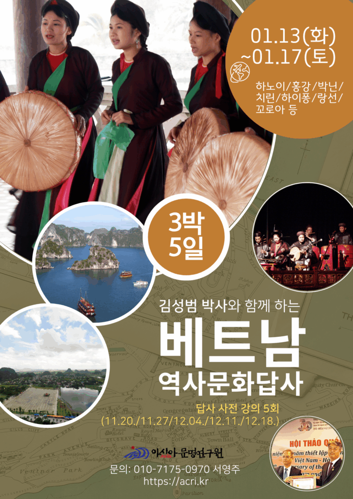 새로운 인류 문명에 대한 갈망. 주도적 서구 문명을 흡수한 새로운 아시아 문명 태동의 요구. 아시아 문명으로서 한민족 문명은? 반만년 민족의 역사를 이어 온 한민족(한국)과 월민족(베트남)의 만남. 10여차례 남도의 영산강을 답사한 아시아문명연구원은 그 마음으로 베트남의 홍강을 답사하고자 합니다.